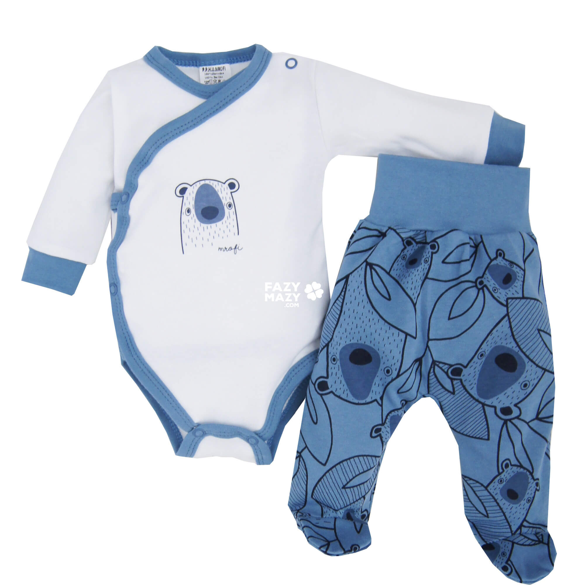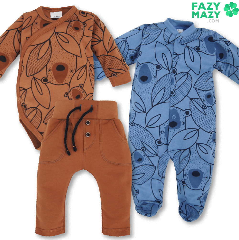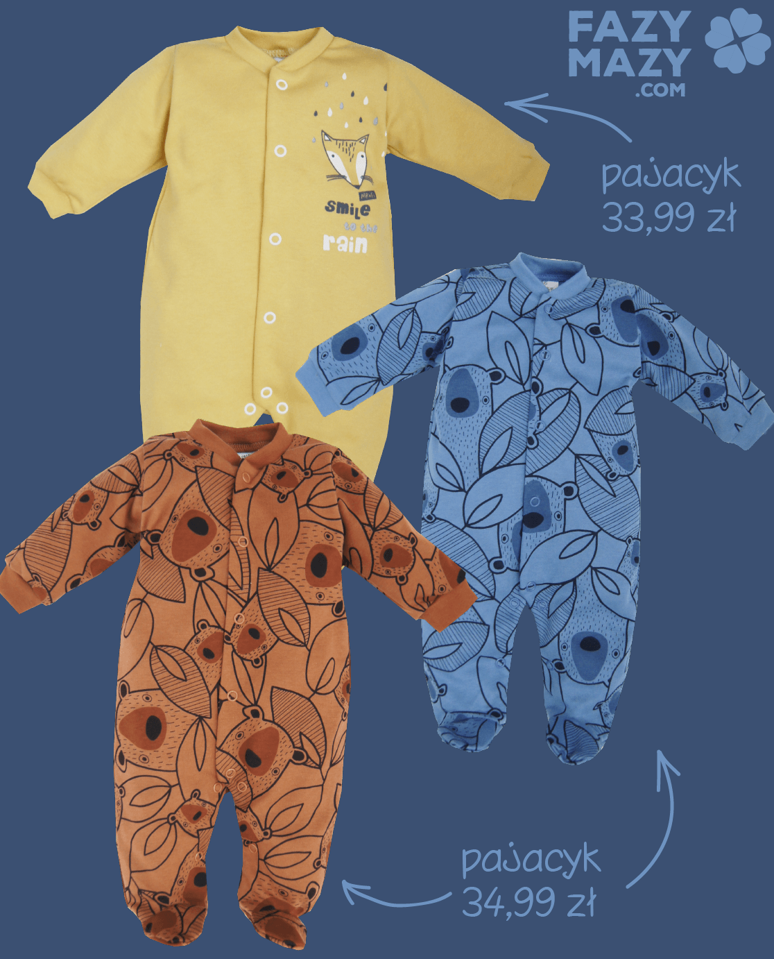 W tym miesiącu do naszego sklepu fazymazy trafiło sporo nowości od Mrofi, jednak jedna kolekcja mocno się wyróżnia. Mowa o misiowej kolekcji w kolorze brązowym i niebieskim. Ubranka niemowlęce w misie i liście, występują w wielu wariantach. W nowej kolekcji znajdziemy body kopertowe oraz body dla starszych dzieci, zapinane na ramionku. Do tego pajace niemowlęce, w rozmiarach aż do 80. Są i śpiochy z kaftanikiem, które polecamy szczególnie dla najmłodszych dzieci. Wygodne zestawy dla dzieci, czyli body i półśpiochy dla dziewczynek i chłopców. Do misiowej kolekcji łatwo skompletujemy też spodnie, idealnie pasujące kolorystycznie do brązowych misiów. Bawełna z której uszyte zostały ubranka jest milutka, i porządna. Ubranka są bardzo ładnie wykonane, zapinane na antyalergiczne napki zatrzaskowe, i mają wygodne kroje - dzięki czemu zapewniają dziecku komfort i swobodę ruchów. Wiemy już teraz, że misiowa kolekcja ubranek Mrofi będzie dość krótka, dlatego jeśli chcecie zaprosić misia do szafy Waszego dziecka - warto zrobić to wcześniej!