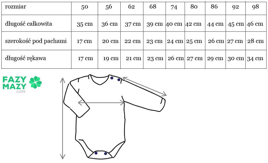 Body z długim rękawem, wykonane z delikatnej i przyjemnej w dotyku bawełny w kolorze jasno niebieskim, zostało uszyte w Polsce. Aby zapewnić wygodę i funkcjonalność, ubranko jest rozpinane po całej długości oraz w kroczku, dzięki czemu przebieranie i pielęgnacja dziecka stają się łatwiejsze. Ponadto, z myślą o delikatnej skórze maluchów, zapinane jest na antyalergiczne oraz bezniklowe napki.